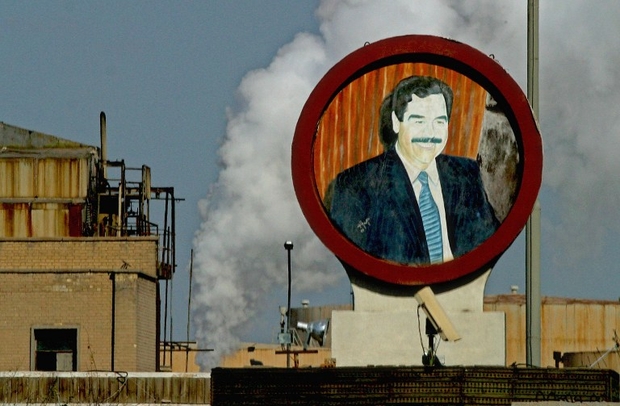 Photo : De la fumée s’échappe de la raffinerie de pétrole al-Dorra à Bagdad en arrière-plan du portrait du président irakien Saddam Hussein, le 5 février 2003 (AFP).
