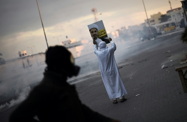 Photo : un manifestant bahreïni brandit une pancarte représentant un portrait de Cheikh Ali Salman, chef du mouvement d’opposition al-Wefaq, lors d’affrontements avec la police antiémeute suite à une protestation contre l’arrestation de Salman dans le village de Sitra, au sud de la capitale Manama, le 29 janvier 2016 (AFP).