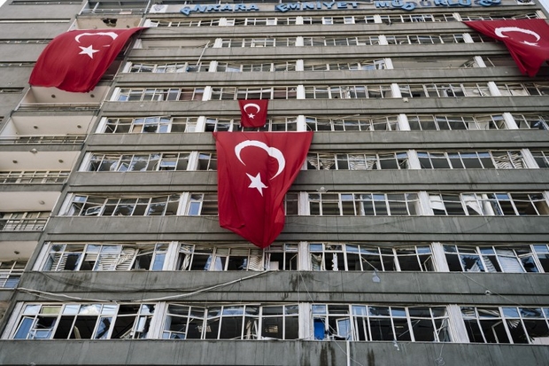 Photo : le siège de la police d’Ankara endommagé après avoir été bombardé pendant la tentative de coup d’État du 15 juillet (AFP).