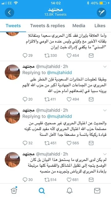 Un commentateur saoudien bien informé mais anonyme, qui utilise le pseudo Mujtahidd sur Twitter, a écarté la théorie selon laquelle Hariri se sentait menacé d’assassinat par l’Iran. Il a affirmé que le Premier ministre libanais était davantage menacé par le groupe État islamique.