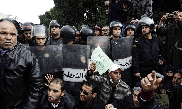 Photo : des manifestants se tiennent devant des policiers lors d'une manifestation à Tunis, le 19 janvier 2011 (AFP).