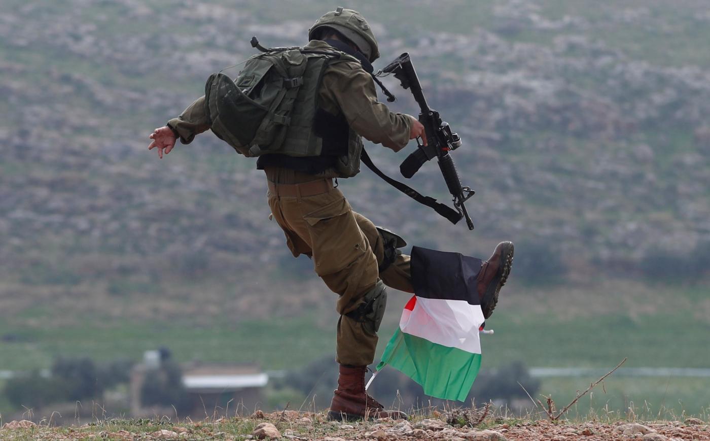 Un soldat israélien donne un coup de pied dans un drapeau palestinien lors d’une manifestation contre le plan du président américain Donald Trump pour le Moyen-Orient, en Cisjordanie occupée le 29 janvier (Reuters)