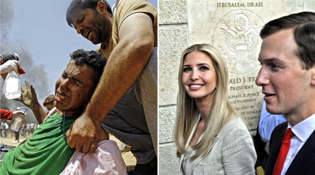 Photo : deux mondes parallèles : un manifestant blessé est soigné à Gaza ; Ivanka Trump et Jared Kushner assistent à l’ouverture de l’ambassade des États-Unis à Jérusalem. Deux événements qui, le 14 mai 2018, se déroulaient à moins de 100 km l’un de l’autre (AFP/Reuters).