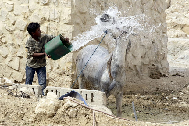 Photo : un garçon rafraîchit un cheval à l’eau douce dans la ville antique de Petra en Jordanie, le 25 mars 2015 (AFP).