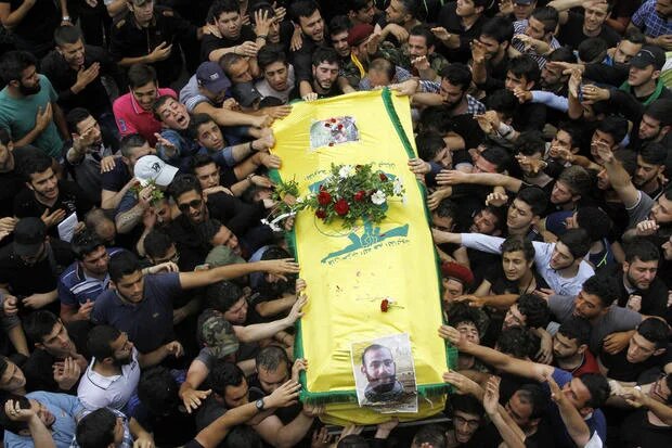Photo : des membres du mouvement chiite libanais Hezbollah portant le cercueil d’un de leurs camarades, Abd al-Jalil Mohamed Hamdan, au cours de sa procession funéraire le 13 juin 2015, dans la banlieue sud de la capitale libanaise Beyrouth, après qu’il ait été tué au combat aux côtés des forces gouvernementales syriennes dans la région de Qalamoun. (AFP)