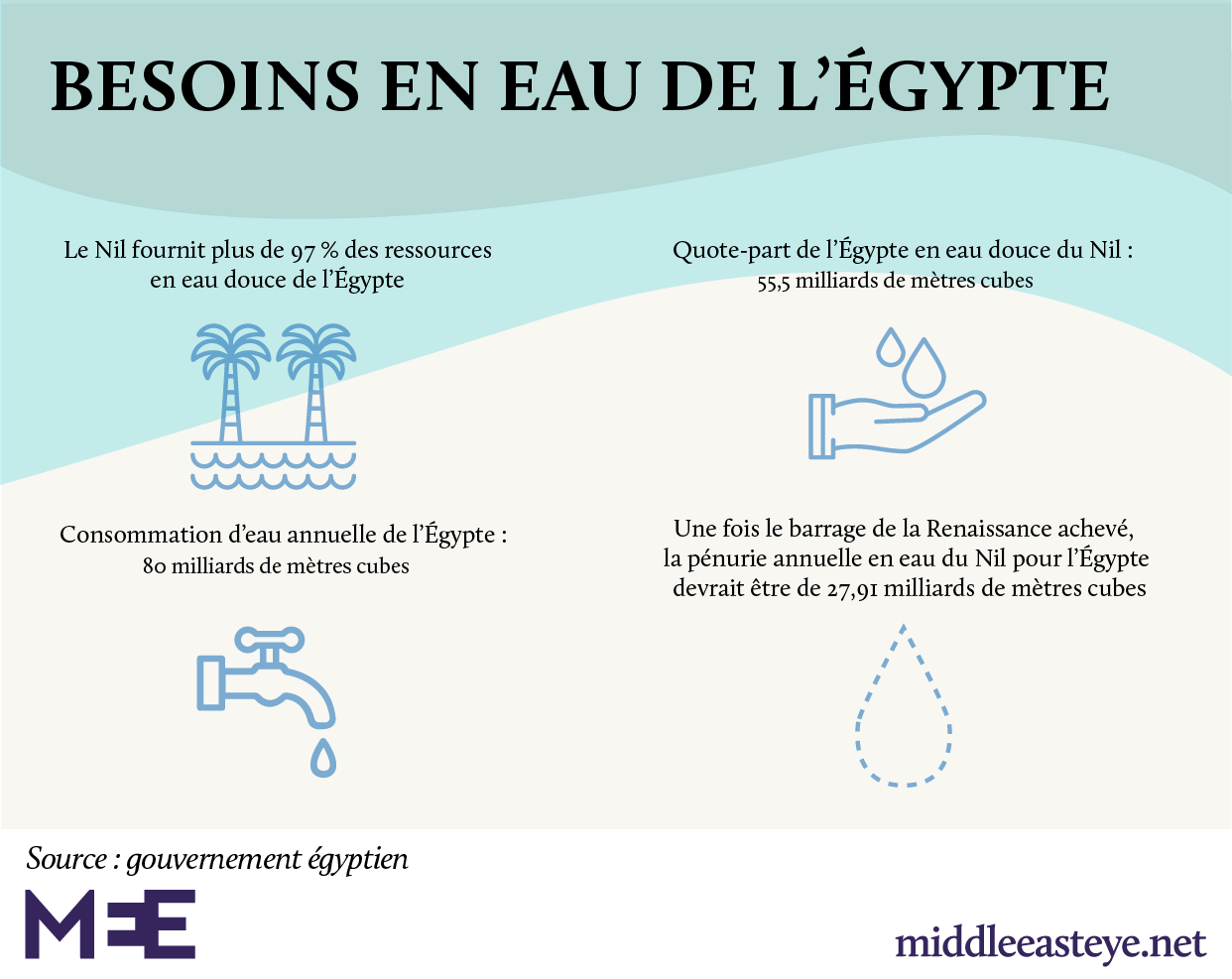 L’eau qui atteint l’Égypte provient d’Éthiopie à 80 %. Une étude de la société géologique américaine publiée en mai 2017 prévoyait que le pays souffrirait d’une pénurie de 25 % de sa quote-part annuelle d’eau si le réservoir était rempli en cinq à sept ans.