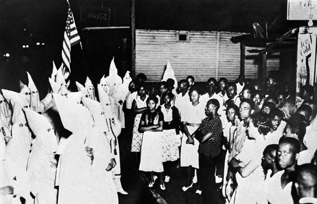 Des membres du Ku Klux Klan harcèlent des habitants noirs, en janvier 1938 (AFP)