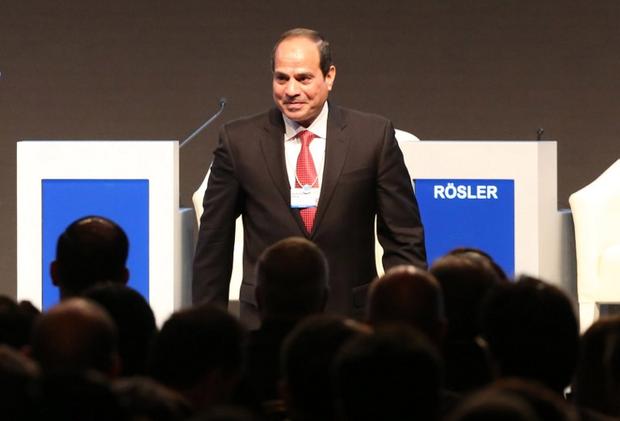 Photo : Le Président égyptien Abdel Fattah al-Sissi se tient sur scène le jour de l'ouverture du Forum économique mondial sur le Moyen-Orient et l'Afrique du Nord 2015, le 22 ma,i dans la station balnéaire de la mer Morte de Shuneh, à l'ouest d'Amman, la capitale jordanienne.