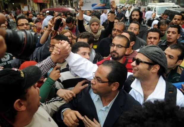 Photo : le co-fondateur du mouvement du 6 Avril, Ahmed Maher, peu avant sa condamnation à trois de prison en décembre 2013, Le Caire, 30 novembre 2013 (AFP).