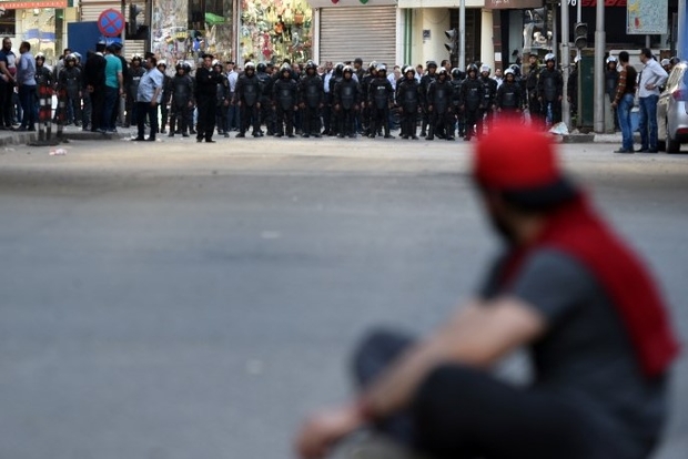 Photo : un manifestant égyptien assis sur le sol devant des policiers anti-émeute, lors d’une manifestation contre un accord controversé sur la cession de deux îles de la mer Rouge à l’Arabie saoudite, le 15 avril 2016, devant le Syndicat des journalistes du Caire (AFP).