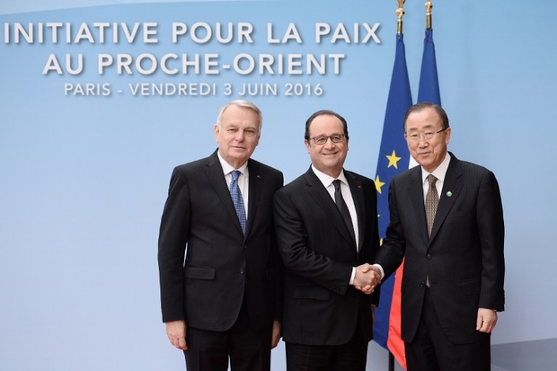 Photo : de gauche à droite, le ministre français des Affaires étrangères Jean-Marc Ayrault, le président français François Hollande et le secrétaire général de l’ONU Ban Ki-moon, lors de l’ouverture de la réunion internationale pour une « Initiative pour la Paix au Proche-Orient », le vendredi 3 juin 2016 à Paris (AFP).