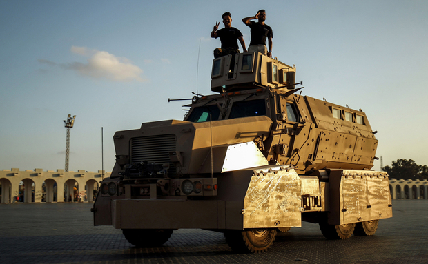 Photo. 27 juillet 2017, partie orientale de la ville de Benghazi : des membres de l’Armée nationale libyenne, fidèles à Khalifa Haftar, font un bref V de la victoire du haut d’un véhicule blindé (AFP).