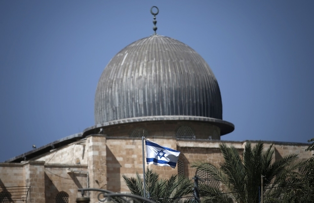 Crédit photo : un drapeau israélien flotte sur le toit d’une colonie israélienne à Jérusalem-Est, en face de la coupole de la mosquée al-Aqsa