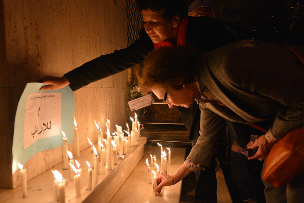 Photo : Une femme pose une affiche sur laquelle est écrit en arabe « Non au terrorisme » au dehors du consulat Français à Rabat, Maroc, le 15 Novembre 2015 (AFP).