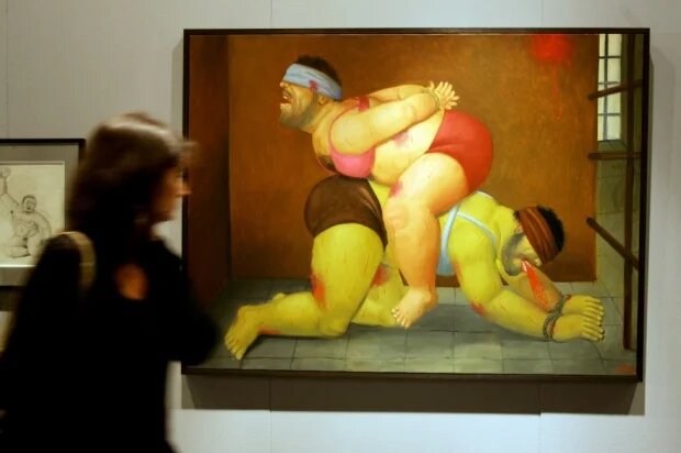 Légende photo : peinture de l'artiste Fernando Botero, inspirée du scandale des abus dans la prison d'Abou Ghraib en Irak, exposée au palais de Venise, à Rome, le 16 juin 2005 (AFP).