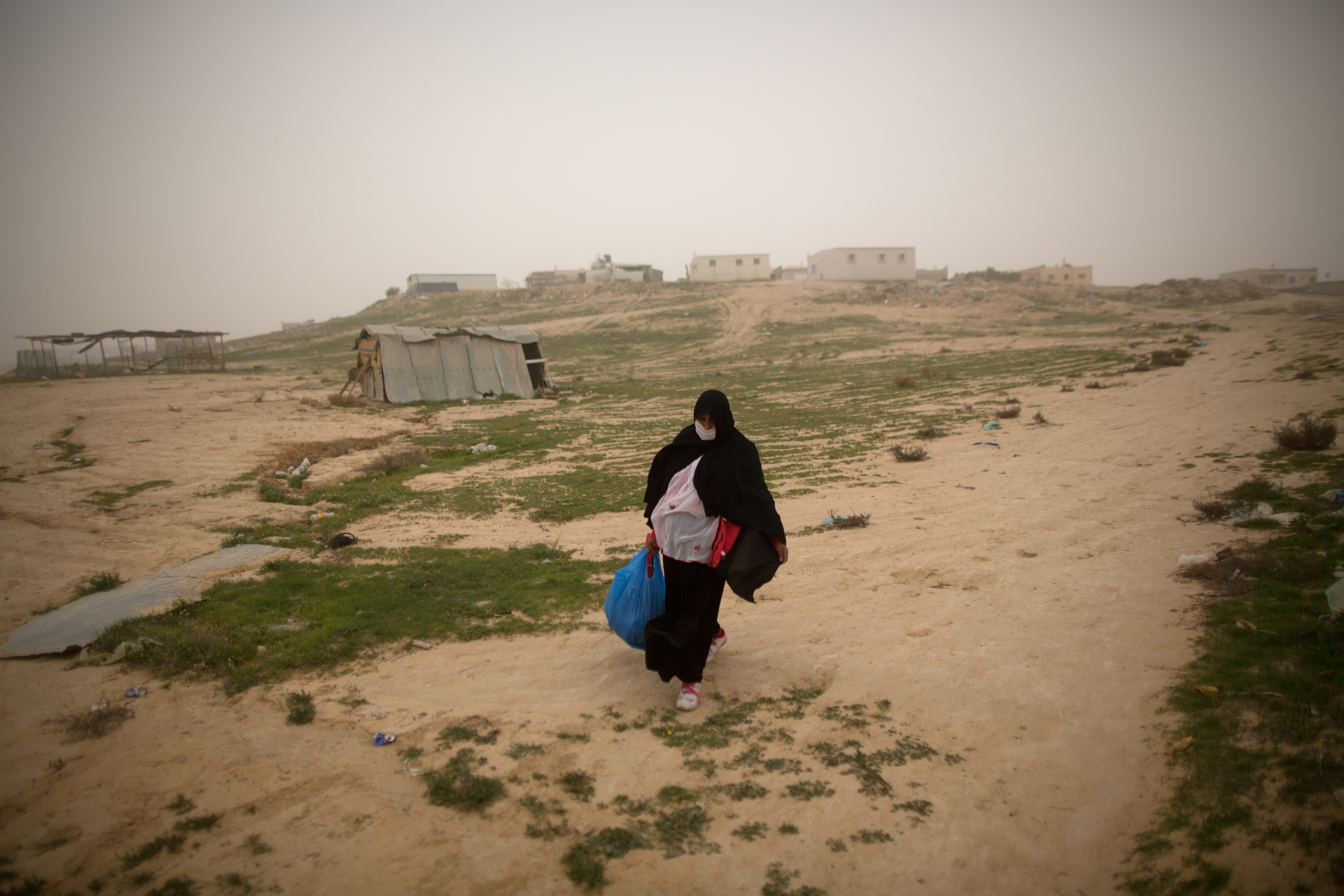 Photo : Une femme bédouine israélienne marche lors d’une tempête de sable dans le village bédouin de Segev Shalom, dans le désert du Néguev, près de la ville israélienne du sud Beersheva, le 10 février 2015 (AFP).