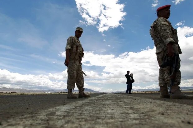 Photo : des soldats yéménites inspectent les dégâts causés par des frappes aériennes de la coalition menée par les Saoudiens sur le tarmac de l’aéroport international de Sanaa, contrôlé par les rebelles, le 5 mai 2015 (AFP).