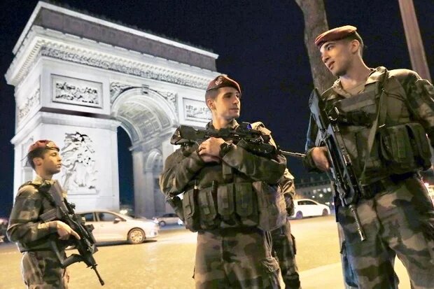 Photo : des soldats français montent la garde devant l’Arc de Triomphe à Paris après qu’un policier a été abattu et deux autres blessés sur les Champs-Élysées dans une attaque revendiquée par l’EI le 20 avril 2017, à trois jours du premier tour de l’élection présidentielle française (AFP).