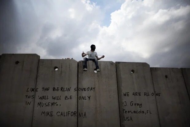 Photo : un manifestant masqué est assis sur le mur de séparation israélien en Cisjordanie le jour de la Nakba (AFP).