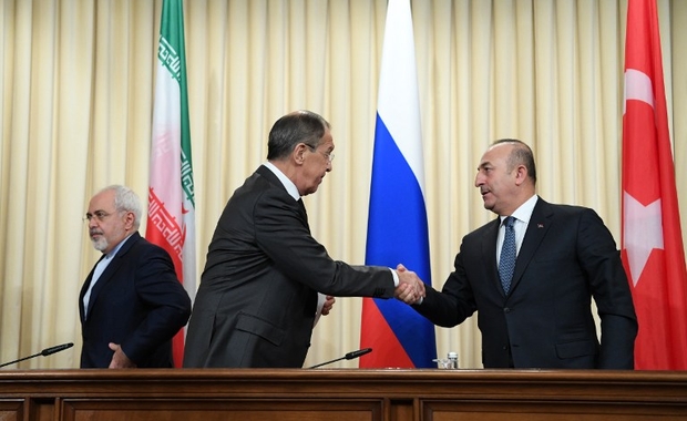 Photo : poignée de main entre le ministre russe des Affaires étrangères Sergueï Lavrov (au centre) et son homologue turc, Mevlüt Çavuşoğlu (à droite), sous le regard du ministre iranien des Affaires étrangères Mohammad Javad Zarif (à gauche) après une conférence de presse à Moscou, le 20 décembre 2016 (AFP).
