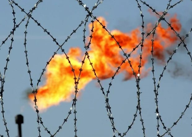 Photo : une flamme de gaz jaillit derrière un fil de fer barbelé, sur un site de production de Rosneft, à Prirazlomnoye, en Sibérie occidentale (AFP).