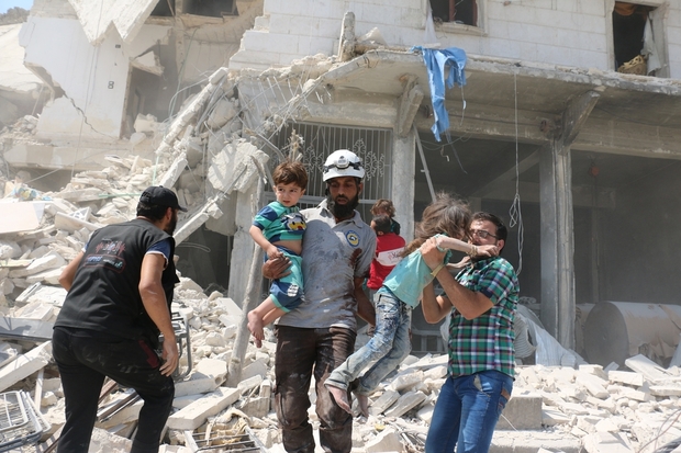Photo : des civils et un secouriste syriens évacuent des enfants dans le quartier d’al-Maadi, dans l’est d’Alep, après que des avions du gouvernement auraient largué des bombes barils chargées d’explosifs, le 27 août 2016 (AFP).