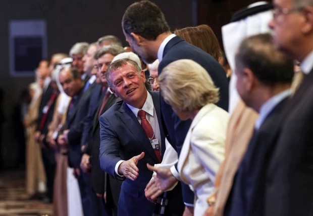Photo : Le roi Abdallah II de Jordanie cherche à serrer la main du roi Philippe VI d’Espagne lors de l’ouverture du Forum économique mondial dans la région de la mer Morte, à l’ouest d’Amman, le 20 mai 2017 (AFP).