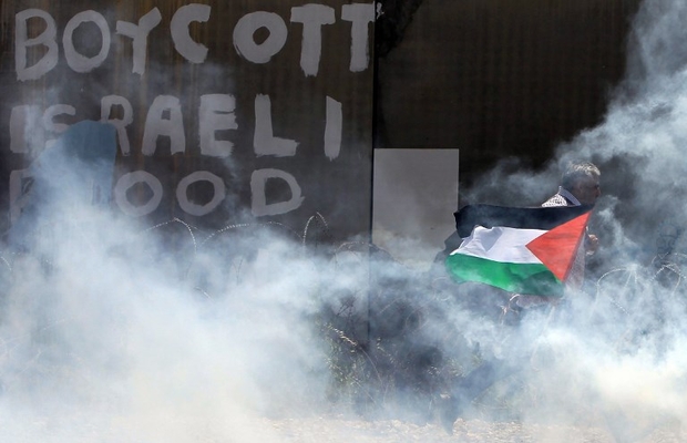 Photo : un manifestant palestinien brandit le drapeau national alors qu’il passe près d’une partie du mur de séparation d’Israël au milieu de la fumée due au gaz lacrymogène tiré par des troupes israéliennes afin de disperser la manifestation hebdomadaire contre l’occupation israélienne, le 13 juin 2014 dans le village de Bilin, en Cisjordanie (AFP).