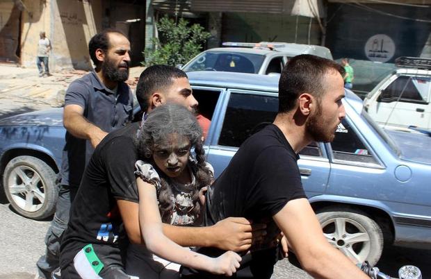 Photo : des Syriens transportent une fillette blessée à l’hôpital après que les forces gouvernementales ont bombardé le quartier d’al-Magair contrôlé par l’opposition, à Alep, le 21 juillet 2015 (AA).