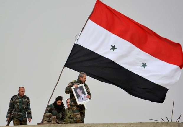 Photo : un combattant des forces fidèles à Bachar al-Assad brandit un portrait du président syrien tandis que ses camarades se reposent près d’un drapeau national syrien après la prise de contrôle d’un secteur de Deir al-Adas, une ville située dans la campagne de Deraa, au sud de Damas, le 10 février 2015 (Reuters).
