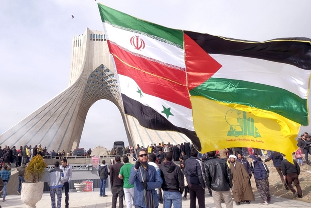 Photo : un homme porte un drapeau géant composé des drapeaux de l’Iran, de la Palestine, de la Syrie et du Hezbollah, lors d’une cérémonie marquant le 37e anniversaire de la Révolution islamique, à Téhéran, le 11 février 2016 (Reuters).
