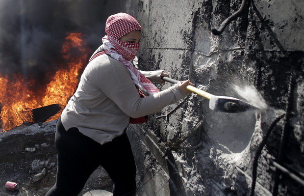 Photo : une manifestante palestinienne se sert d’une hache pour tenter de détruire une portion du mur israélien controversé qui sépare la ville cisjordanienne d’Abu Dis de Jérusalem-Est lors d’affrontements avec les forces de l’ordre israéliennes, le 2 novembre 2015 (AFP).