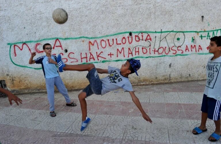 Photo : De jeunes Algériens jouent au football à Bab el Oued. Selon les statistiques officielles, 55 % de la population a moins de 30 ans (AFP).