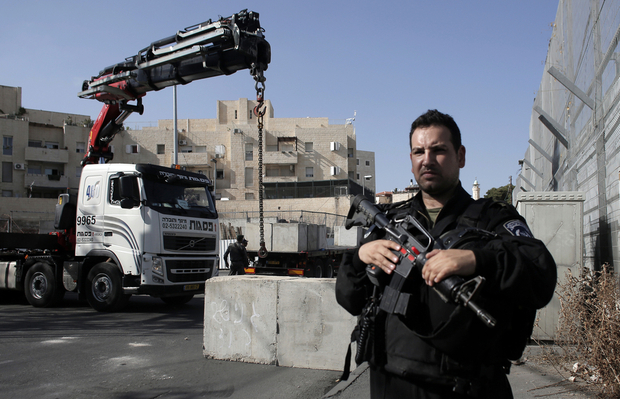 Photo : un soldat israélien monte la garde tandis qu’une grue dépose des blocs de béton à l’une des entrées de Jérusalem-Est (AFP).