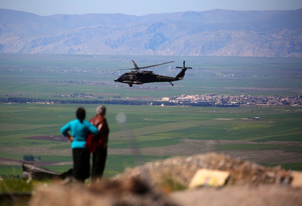 Photo : un hélicoptère médical, de la coalition dirigée par les États-Unis, survole le site des frappes aériennes turques près du nord-est de la ville kurde syrienne de Dayrik, connue sous le nom d’al-Malikiyah en arabe, le 25 avril 2017 (AFP).