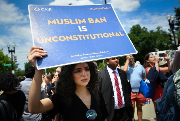 Photo : des manifestants protestent contre le « Muslim ban » prononcé par Trump devant la Cour suprême des États-Unis, à Washington, le 26 juin 2018 (AFP).