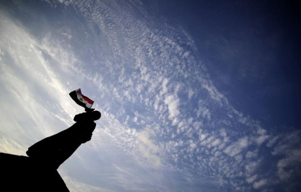 Légende photo : drapeau égyptien flottant sur une statue place Tahrir, au Caire, 2011 (AFP).
