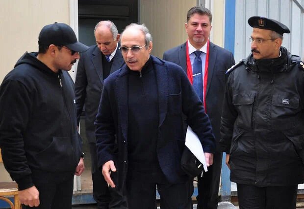Photo : l’ancien ministre de l’Intérieur égyptien Habib el-Adli (au centre) sort de la salle d’audience après son nouveau procès à l’académie de police du Caire le 24 février 2015. El-Adli et l’ancien Premier ministre Ahmed Nazif ont été acquittés des accusations de corruption (AFP).