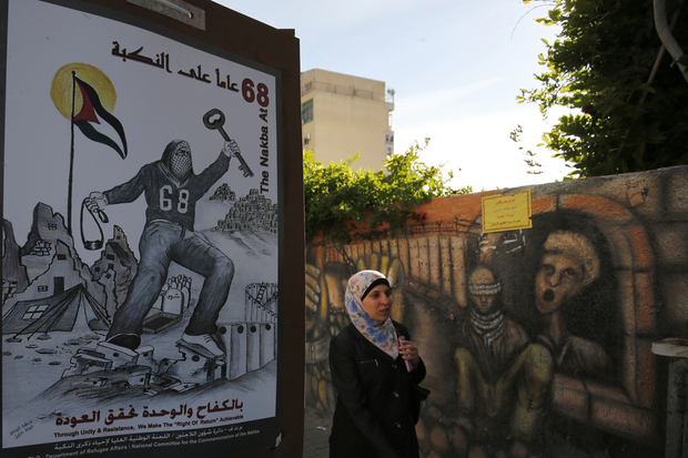 Photo : une Palestinienne passe à côté d’une affiche représentant une clé qui symbolise les clés des maisons laissées par les Palestiniens en 1948, le 11 mai 2016, dans la ville de Ramallah en Cisjordanie occupée, quelques jours avant le 68e anniversaire de la Nakba (AFP).