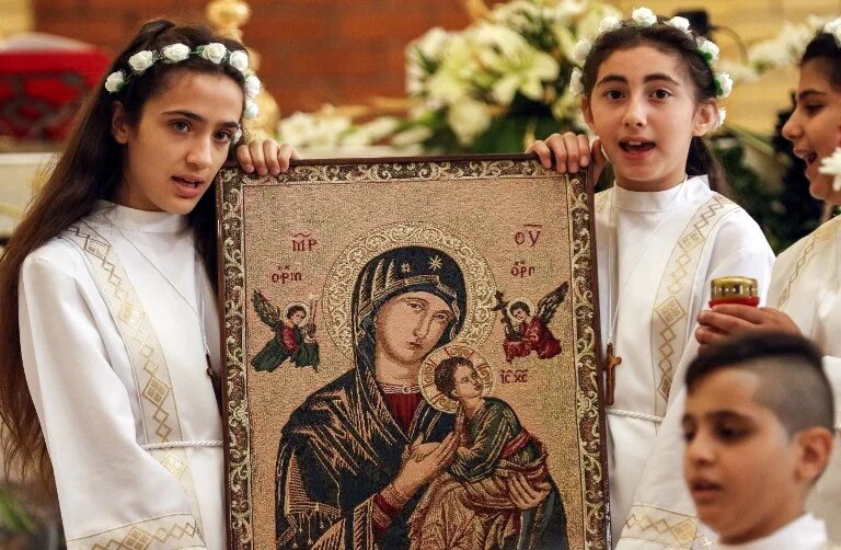 Photo : des fillettes irakiennes, chrétiennes chaldéennes, brandissent une icône représentant la Vierge Marie tenant l’enfant Jésus lors d’une messe de première communion chez les apôtres Pierre et Paul, dans l'église catholique chaldéenne à Erbil, capitale de la région kurde autonome d’Irak (AFP).