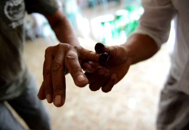 Photo : un fonctionnaire électoral aide un électeur à appliquer de l’encre sur son doigt, dans un bureau de vote à Kuta, sur l’île touristique indonésienne de Bali, le 9 décembre 2015. L’Indonésie est la plus grande démocratie à majorité musulmane au monde.