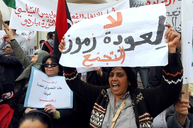 Photo : une femme brandit une affiche indiquant « Non au retour du RCD [l’ancien parti de Ben Ali] » et manifeste aux côtés de plusieurs milliers de Tunisiens, le 24 avril.