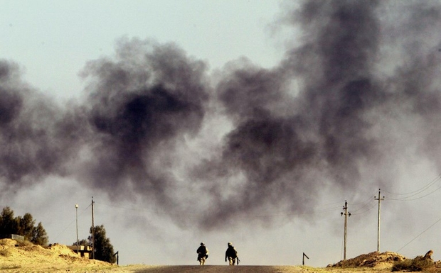 Photo : des soldats américains patrouillent sur une route alors qu’une fumée noire épaisse s’échappe d’un puits de pétrole en flammes, devant le gisement pétrolier irakien de Rumaila, le 23 mars 2003 (AFP).