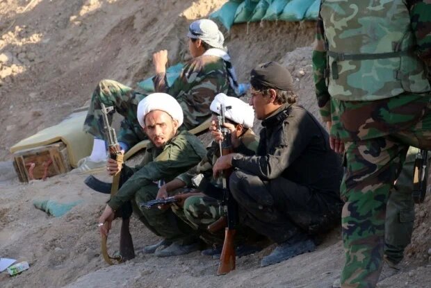 Photo : 18 Avril 2015, les forces peshmergas (kurdes irakiens) et les factions d’al-Hashd al-Shaabi occupent une position à proximité du village de Bashir dans le quartier de Qatqa Daquq (45 km au sud de Kirkouk), suite au lancement d’une campagne destinée à reprendre au groupe Etat islamique (EI) les villages environnants (AFP).
