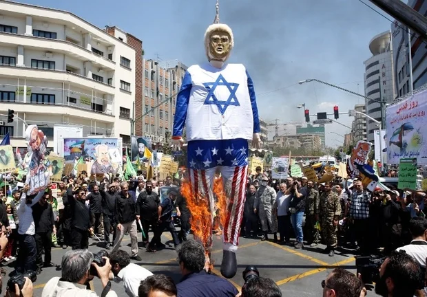 Des manifestants iraniens brûlent une effigie du président américain Donald Trump vêtu d’un drapeau israélien lors d’un rassemblement pour marquer la « journée d’al-Qods » (le jour de Jérusalem), le 8 juin 2018 (AFP)