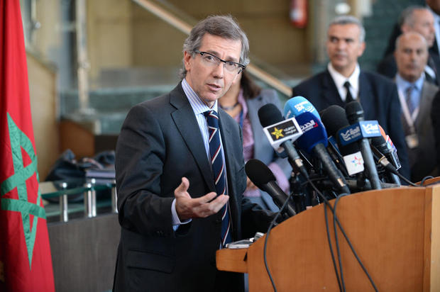 Photo : le représentant spécial et responsable de la mission d’appui des Nations unies en Libye, Bernardino Leon, donnant une conférence de presse préliminaire à un nouveau cycle de négociations de paix au sujet du conflit libyen le 15 avril 2015 dans la ville marocaine de Skhirat, à vingt kilomètres au sud de Rabat (AFP)