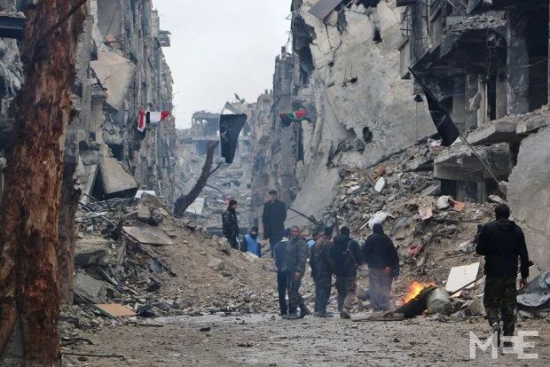 Légende photo : des réfugiés palestiniens tentent de se réchauffer autours d’un feu au milieu des décombres à Yarmouk (MEE).