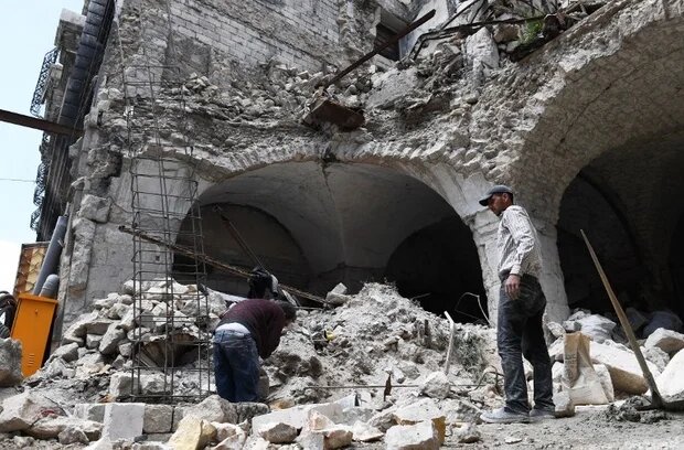 Photo : des Syriens restaurent un magasin dans la vieille ville d’Alep, le 22 avril (AFP).