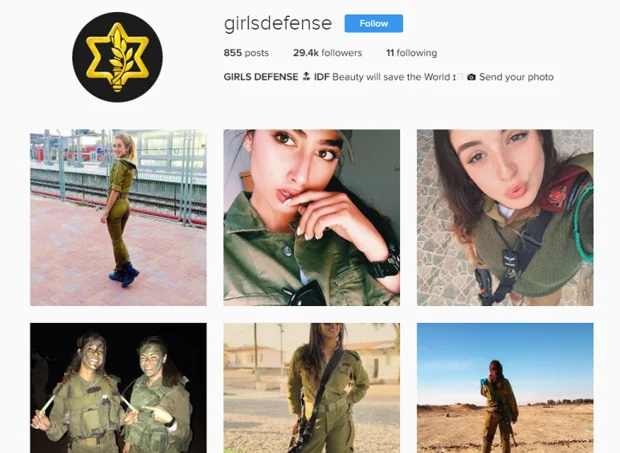 Des comptes Instagram comme « hotisraeliarmygirls » (filles sexy de l’armée israélienne) et « girlsdefense » (filles de la défense) ne sont que quelques-uns de ceux spécifiquement consacrés à afficher des images à caractère sexuel de soldates, où les femmes sont montrées en uniforme et bikini. Même une recherche sur Google de « femmes israéliennes » aura pour principal résultat des images de soldates.