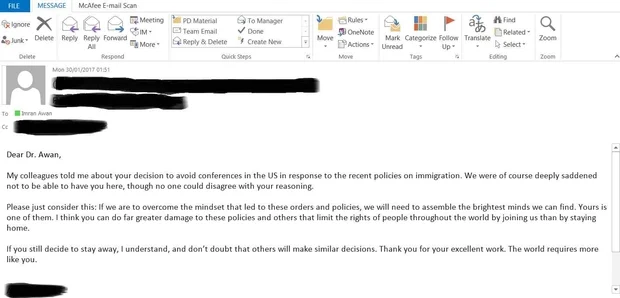 Mes collègues m'ont parlé de votre décision d'éviter les conférences aux États-Unis en réponse aux récentes politiques en matière d'immigration. Nous avons bien sûr été attristés de ne pas pouvoir vous accueillir ici, bien que personne ne puisse être en désaccord avec votre raisonnement.